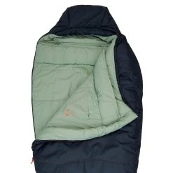 Auffällig ist der lange Reißverschluss auf der Oberseite. Er ist leicht zu öffnen und erlaubt auch die Öffnung von der Fußseite aus. Durch den runden Verlauf kannst du deine Füße aus dem Schlafsack stecken und auf der Oberseite ablegen. Eine kleine Außentasche ermöglicht dir außerdem das Verstauen deiner Brille oder Stirnlampe, um die wichtigsten Gegenstände immer in Griffweite zu haben.