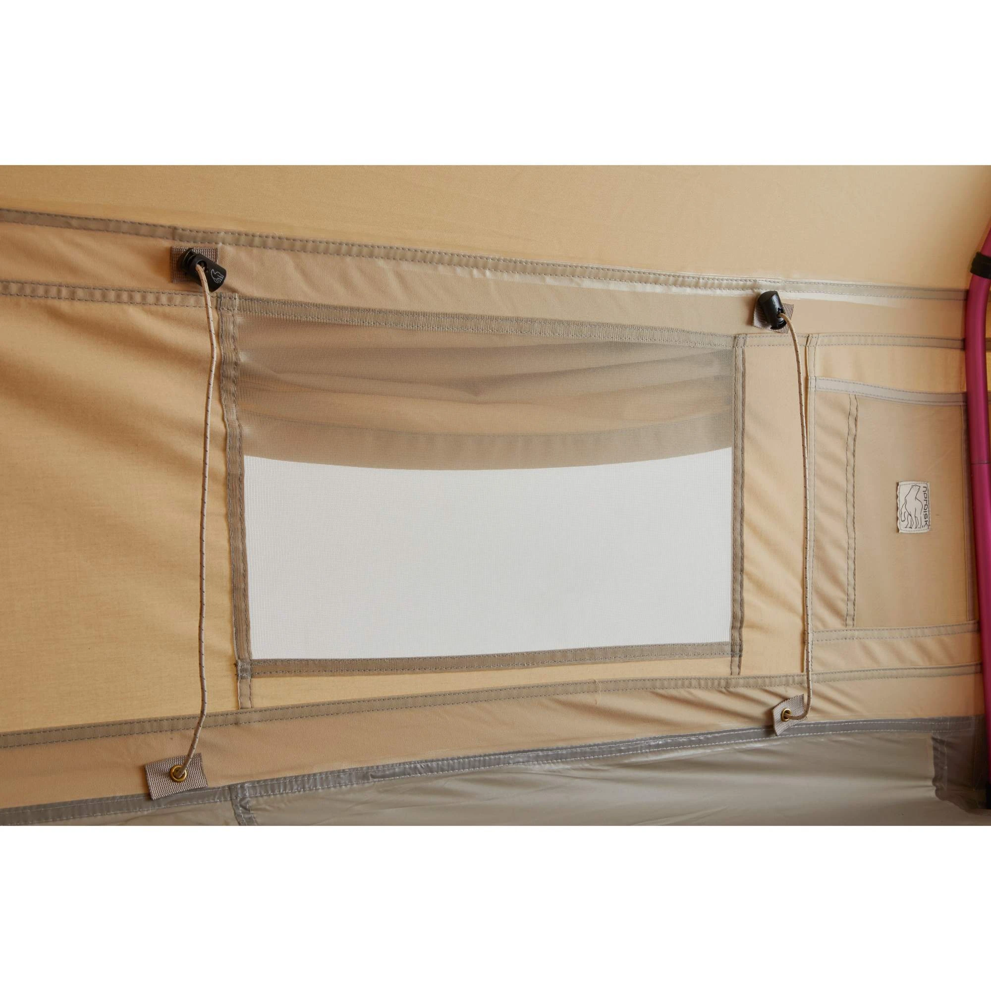 Die seitlichen Wände bestehen aus temperaturregulierendem Polyester-Baumwoll-Mischgewebe. Sie sind wasserdicht und dennoch atmungsaktiv, wodurch es sich auch im Sommer gut im Zelt aushalten lässt. Für noch mehr Frischluft kannst du die seitlichen Ventilationsöffnungen zur Belüftung öffnen. Das Moskitonetz verhindert dabei, dass ungebetene Gäste ins Zelt gelangen.