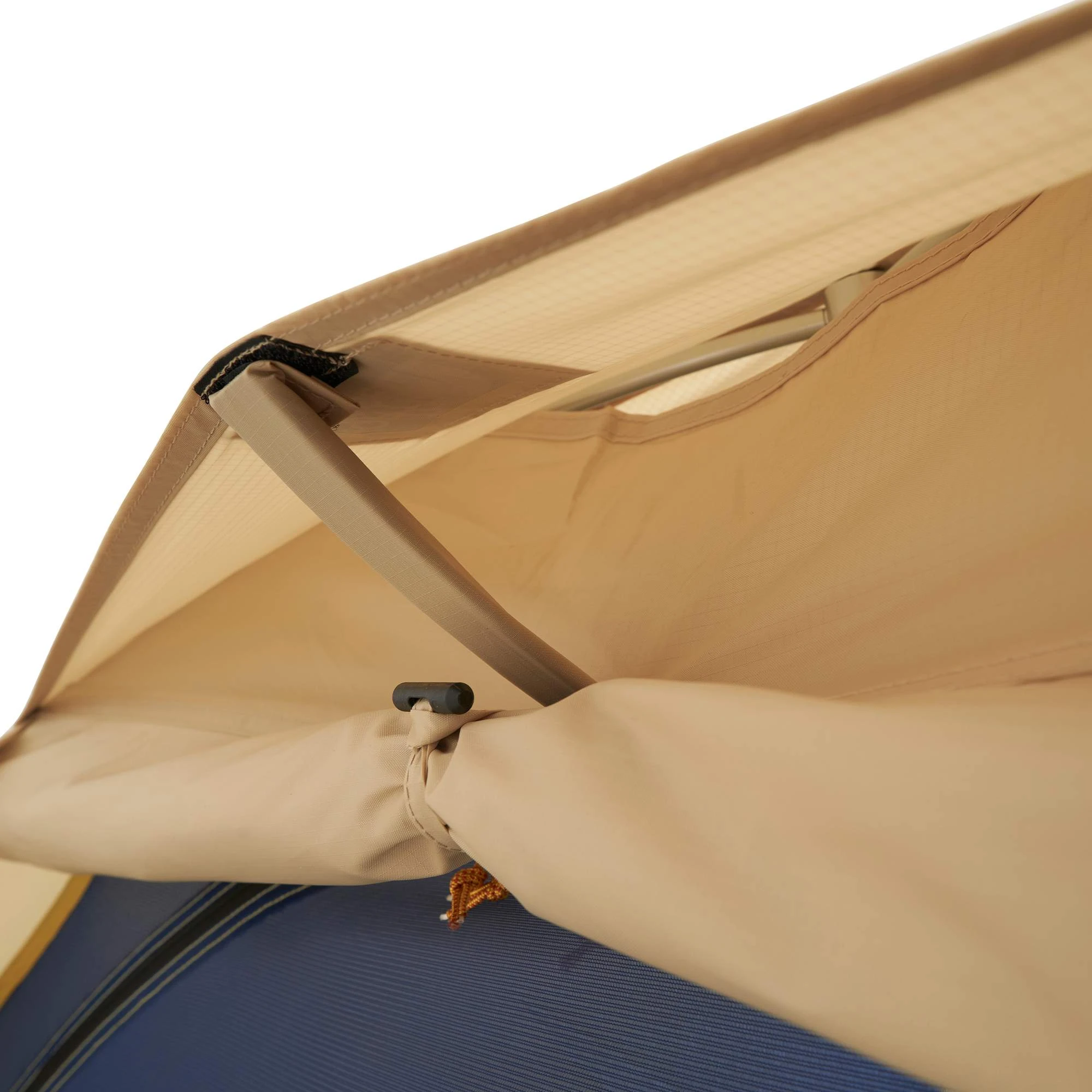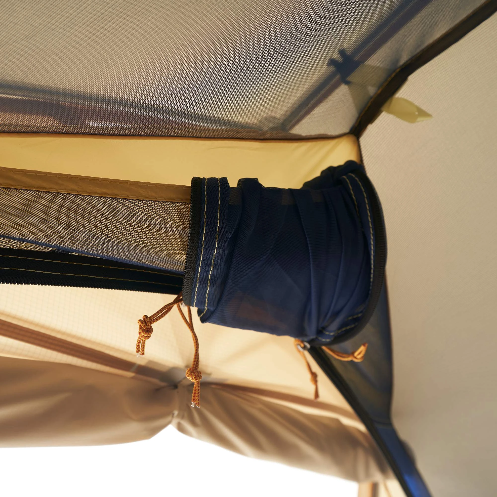 Praktische Kleinigkeiten bieten einen hohen Komfort. So musst du die Eingangstür nicht umständlich aufrollen, sondern kannst sie geöffnet in einer Deckentasche verstauen. Dadurch liegt sie auch nicht im Weg, wenn du deinen Schlafplatz auf- oder abbaust. Vier Mesh-Seitentaschen nehmen zudem Kleinteile wie Stirnlampe, Ladekabel oder Smartphone auf. Die drei Schlaufen im Zelthimmel ermöglichen das Spannen einer Wäscheleine oder das Aufhängen einer Zeltlaterne.
