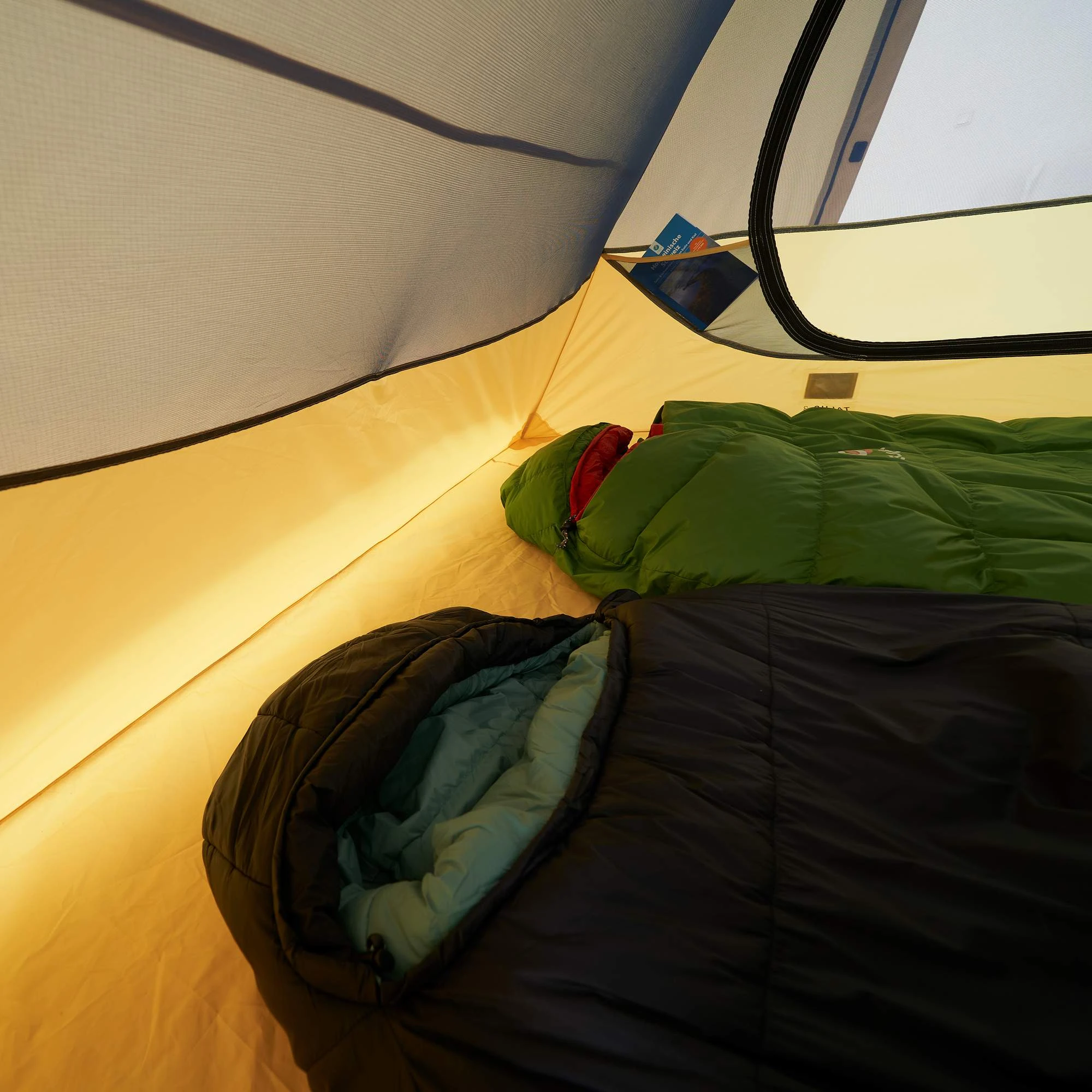 - Hochgezogene Bodenwanne im Fuß- und Kopfbereich, um den Kontakt von Schlafsack und Außenzelt zu verhindern
